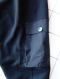 両脇線を前に出し、前身小さめの切り替え線を利用し両サイドに黒ナイロンの玉ブチポケットのなかに黒ZIP を配したデザイン。