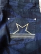 薄手ライトオンスのデニム素材に大柄カモフラージュ柄を黒×ダークブルーで施したアート感覚が◎の一品です。