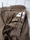 フロントにワンタックを施し太腿上部にBOXプリーツ付きのかーふぉポケットを配し、後ろポケット、カーゴポケットのフラップも同様の隠し釦仕様にしたあたりも◎。