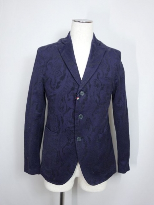 良質光沢のあるコットンで編み上げられたネイビーカラーのペーズリージャガードを生地に織り込んだシングルジャケットです。