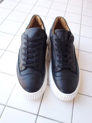 革表面にシワのあるシュリンクレザーの黒革を使用したストライプの凹凸のある肉厚ホワイトソールを使用したBIGフットの大人のスニーカーに仕上がりました。