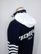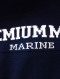 フードのドローコードも黒×白にP.M.D.Sロゴプリントのオリジナルゴムのドローコード。左袖には5本ラインを配し、背中には大きくPREMIUM MOOD MARINをニットジャガードで編み込んだバックロゴも秀逸。