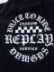 フロントセンターに小さく花文字のREPLAYロゴ+チェッカーフラッグを白プリント。
