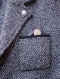 左胸のパッチポケットには黒ベースの花柄プリントのポケットチーフを配し、どこかダンディさを感じさせる仕上がりとなっています。