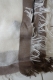 透けるような薄手編み地にモカ茶のパネル柄とフリンジを施した上品な一枚。