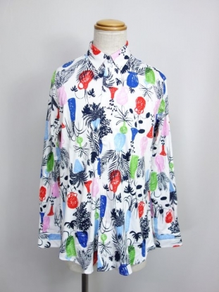 ピンク/赤/黒/サックスの花瓶からダークグリーンの植物が植えられたハッピーなグラフィックが秀逸なシャツです。