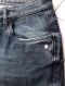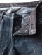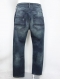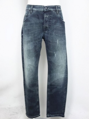 デニム生地の上から全体に大柄な同色カモフラージュ柄をさり気に全面プリント。はっきりカモフラージュ柄を目立たせるでもなく、さり気にシャドープリントし、製品洗い+職人による味出しデストロイト加工(ビンテージ穴開き加工)で仕上げられたジーンズとなっています。