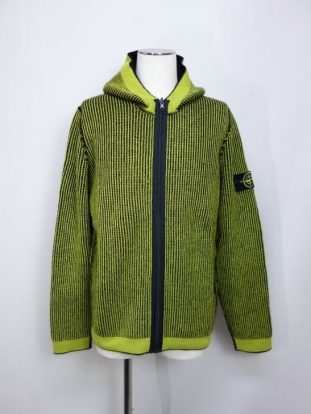 中肉のWニット、裏は黒、表にキミドリカラーがストライプ状に現れるフルZIPのニットパーカーです。