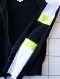 袖付けは首元から切り替えられたラグラン袖の袖山部分に袖口まで8㎝巾の白の側章太ライン切り替え。エルボー部分に蛍光キミドリ×黒の配色。