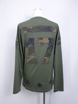 背中に大きく17番のナンバーリングを迷彩カラーの生地でパッチワークした同色カーキの長袖Tシャツです。