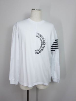 胸センターで切り替え、左胸部分にラウンドのハーフロゴ、PREMIUM MOODを黒でプリント。左袖上腕に5本ラインの黒プリントを施した日本別注の長袖Tシャツとなっています。