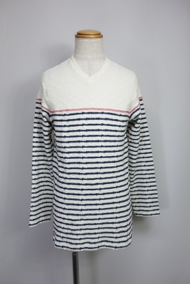 生成りベースの編み柄ジャガードの無地と紺色ボーダーとを上手に組み合わせた立体感のあるVネックのロンTです。