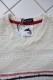 袖から胸上部切り替え部分には赤色ステッチの飾り3本針のデザインステッチ。
