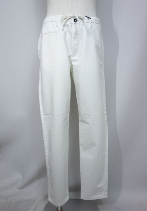 フロント斜めポケット、後ろ両玉ブチデザインポケット。左前に両玉ブチのコインポケットを配したチノパンツデザイン。ウエスト帯部分には共地ドローコードを配したドレスとカジュアルを融合させた作りが時代の一品となっています。