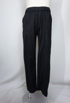 ウエストはドローコード+ゴムギャザー仕様。同色黒のドローコードの先はラバーコーティングのチップ加工。フロントデンターラインに黒のラバーのパイピングを裾まで配し、ラグジュアリー感溢れるイージーパンツとなっています。