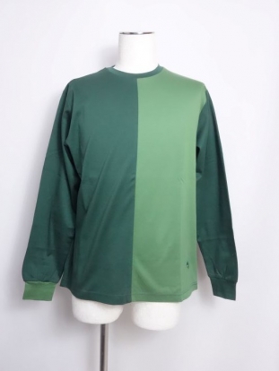 光沢のある極細糸のグリーンカラー2色のALLINI天竺素材を使って作られたツートーンカラー(バイカラー)がユニークなTシャツとなっています。
