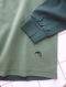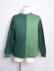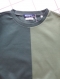 フロントセンターで左右に配色。ダークグリーン×グレイグリーンの配色。ベースはダークグリーンに左前身頃と右袖口リブのみをグレイグリーンで配色。